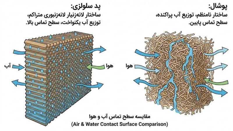 تفاوت اصلی در پد سلولزی بهجای پوشال چوبی است. پد سلولزی سطح تماس آب و هوا را افزایش میدهد، آب را بهتر نگه میدارد و باعث خنککنندگی بیشتر، مصرف آب کمتر و هوای تمیزتر میشود.