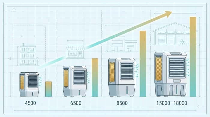 اولین عامل، ظرفیت هوادهی است. هرچه کولر بتواند حجم هوای بیشتری را جابهجا کند، موتور بزرگتر، فن قویتر و ابعاد بدنه بزرگتری لازم دارد و طبیعی است که قیمت کولر سلولزی پلیمری بالاتر برود. کولرهای ۶۵۰۰ و ۸۵۰۰ معمولا برای واحدهای مسکونی و اداری متوسط استفاده میشوند، در حالی که ۱۵۰۰۰ و ۱۸۰۰۰ بیشتر برای فضاهای بزرگ، فروشگاهها و سولهها به کار میروند.