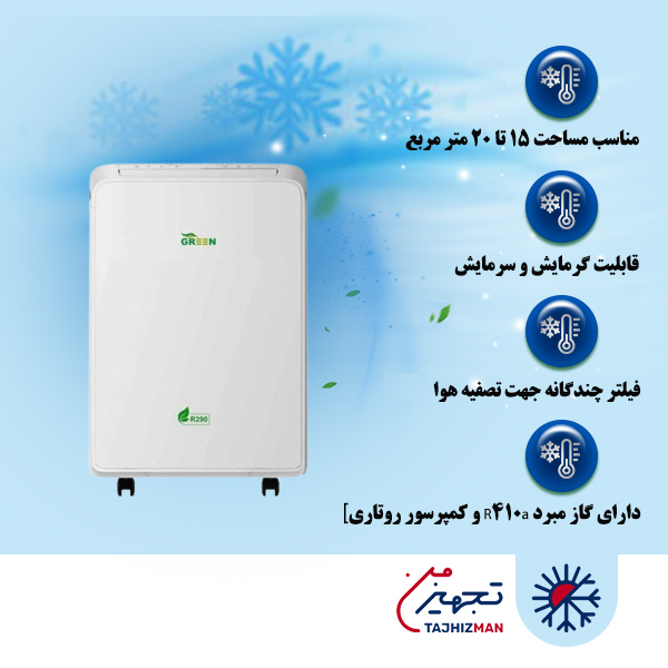 - کولرگازی ۱۲۰۰۰ پرتابل گرین مدل H۱۲P۱T۱A: کمپرسور این کولر جدا از خود دستگاه نبوده و داخل دستگاه قرار گرفته است، برای همین نیاز به نصب جداگانه کمپرسور نیست. این کولر دارای دو موتور است که موتور بالایی کار انتقال جریان هوای خنک و موتور پایینی کار انتقال جریان هوای گرم ناشی از عملکرد کمپرسور را انجام میدهد.