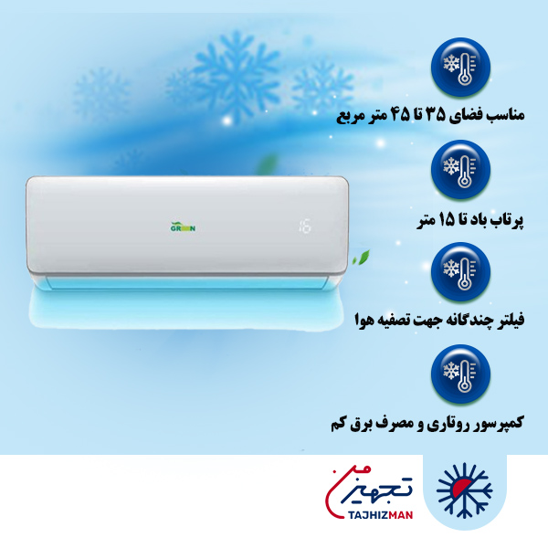 - کولرگازی ۲۴۰۰۰ گرین مدل ON/OFF-R۴۱۰: این کولر که به کولر خاموش و روشن معروف است، دارای اینورتر نبوده و بعد از اینکه دمای محیط به حد مطلوب رسید، کمپرسور خاموش شده و بعد از آنکه دما گرمتر از حد معمول شد، کولر مجدد روشن میشود. این کولر میتواند در یک بازه زمانی ۳۰ ثانیهای محیط را خنک کند.