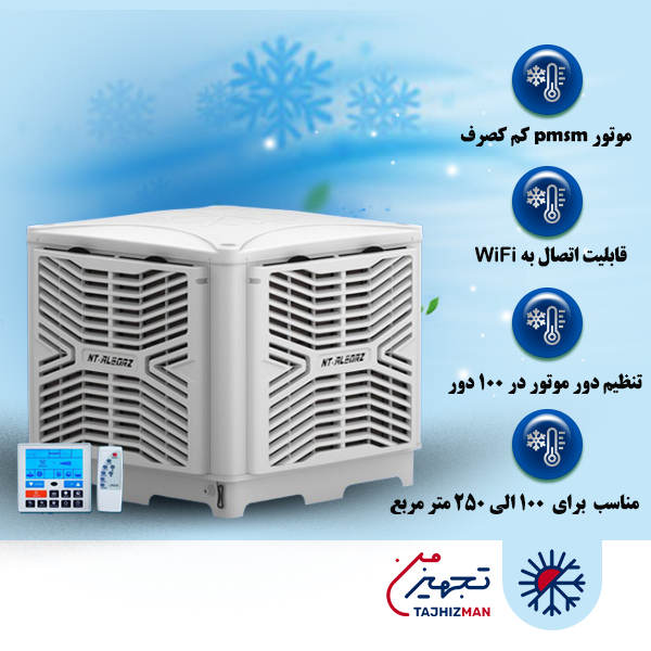- کولر سلولزی پلیمری ۸۵۰۰ مناسب حداکثر 80 تا 180 دارای ریموت کنترل، ترموستات هوشمند تنظیم دما، عمر بالا، و عدم پوسیدگی بدنه