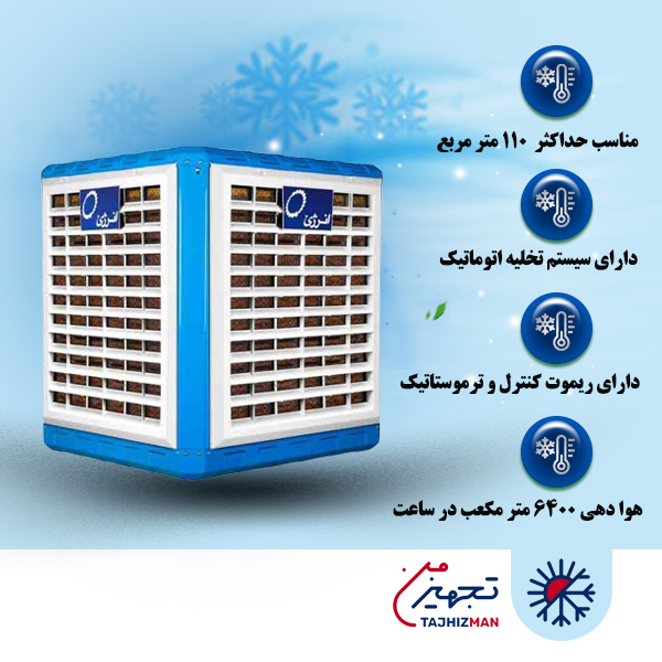 کولر آبی ایران شرق سلولزی ۶۰۰۰ بالازن مدل :IS۶۰AS وجود یک محصول از شرکت ایران شرق گواهی ادعای شرکت است که تنها بهترین برندهای بازار را در فروشگاه خود جمعآوری کرده است. این محصول نیز یکی از بهترین کولرهای سلولزی در بازار است. الکتروموتور این کولر از نوع ۱/۲ اسب بخار و از شرکت موتوژن است. این کولر میتواند یک ساختمان ۱۱۰ متری را بهخوبی خنک کند. اگر قصد خرید اینترنتی کولر سلولزی ۶۰۰۰ ایران شرق را از هر فروشگاه دیگری دارید، حتماً از فروشنده درخواست کنید ریموت کولر نیز به شما تحویل دهد.
