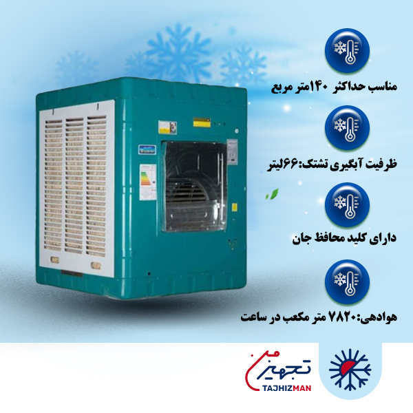 - کولر آبی ۸۰۰۰ ترموستاتیک ایران شرق: هوادهی ۸۰۰۰، متراژ خنککنندگی ۱۴۵ متر