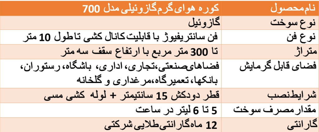 کوره هوای گرم گازی انرژی مدل 700 باراندمان بالای 65% همراه با کنترل خودکار دما قابلاستفاده در سالنها، نمایشگاهها، بانکها و کارخانهها با متراژ 600 تا 900 متر مکعب و امکان نصب در داخل يا خارج سالن بهمنظور تأمین گرمایش محیط میباشند.