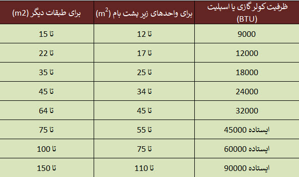 توجه : در صورتی که ساختمان در طبقه آخر باشد و یا ارتفاع سقف بلند تر از 3 متر باشد و یا پنجره ها رو به وجوه شرق یا غرب باشند ضریب اطمینانی در انتخاب ظرفیت کولر گازی باید در نظر گرفته شود بدین معنی که کولر گازی باید کمی قوی تر انتخاب گردد.