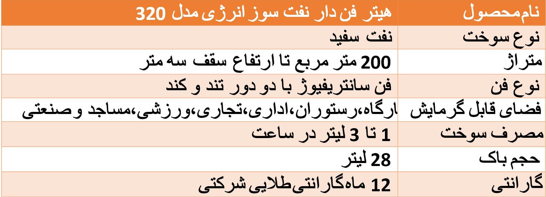 از هیتر نفت سوز انرژی مدل 320 بهطور معمول بهمنظور تأمین گرمایش محیط هایی همانند: ساختمانهای مسکونی، ساختمانهای تجاری، رستورانها، باشگاههای ورزشی، بانکها و مساجد بهوسیله سوخت نفت، استفاده میشود.