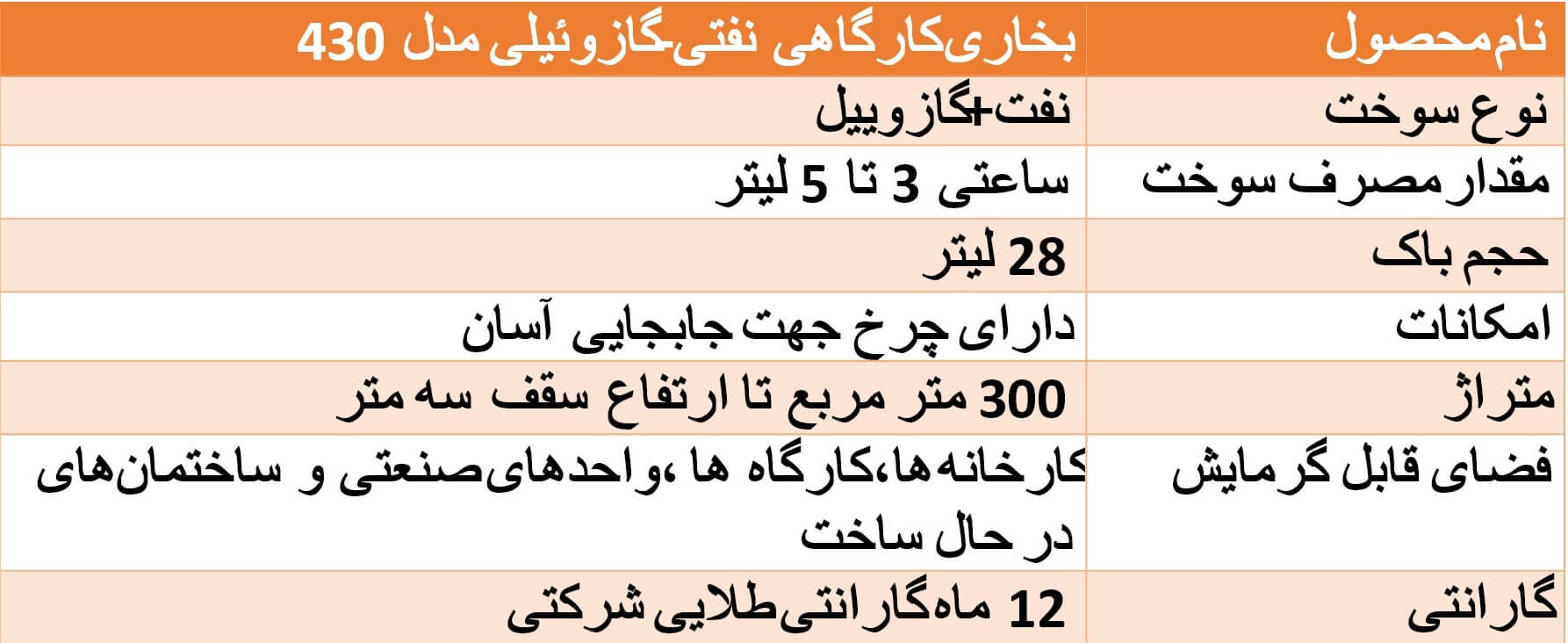 بخاری کارگاهی نفتی-گازوئیلی انرژی مدل 430 برای گرمایش موضعی کارخانه ها و کارگاه های صنعتی و ساختمانی و محل هایی که تهویه هوای مناسبی داشته باشند تا متراژ 300 متر مربع ، کارایی بالایی دارد.