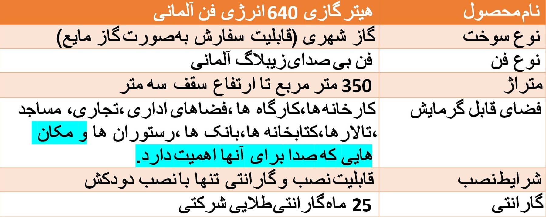 از هیتر 640 انرژی فن آلمانی برای تأمین گرمایش سالنها، بانکها و نمایشگاهها با متراژ 700 تا 900 متر مکعب (300 متر مربع تا ارتفاع سقف سه متر) استفاده میشود که ضمن کنترل خودکار دما، قابلنصب در داخل و یا خارج مکان موردنظر میباشد.