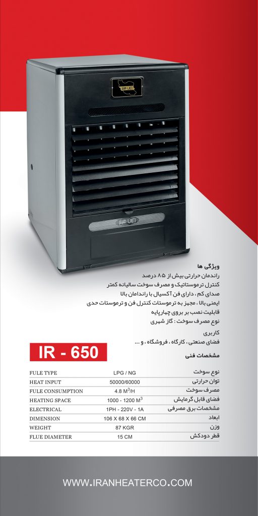 هیتر گازی ایران هیتر مدل IR – 650 با ظرفیت حرارتی 60/000 کیلو کالری بر ساعت مناسب گرمایش مکان های صنعتی، اداری، فروشگاه ها، مساجد و … تا حداکثر 1200 متر مکعب معادل 400 متر مربع با ارتفاع سقف سه متر  میباشد.