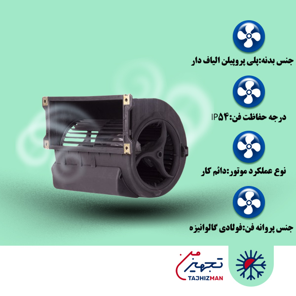 حجم هوادهی در این محصول 950 متر مکعب بر ساعت میباشد.دور موتور این محصول 950 دور بر دقیقه ،توان الکترو موتور 95 وات و جریان 0/45 است.