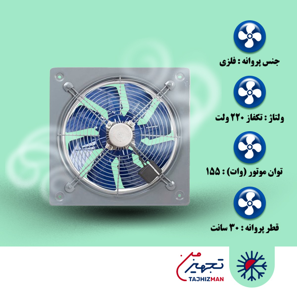 قطر پروانه این هواکش 40 سانتی متر و دارای قاب دور با بدنه 50×50سانتی متر میباشد.