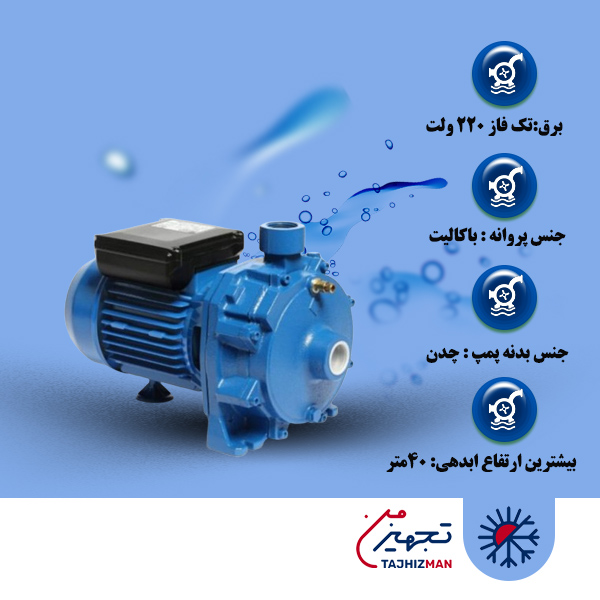 بدنه این پمپ از استحکام بالایی برخوردار می باشد و فشار آب کافی را برای مصارف مورد نظر تامین می کند،و با توجه به نوع برق مصرفی به دو نوع تکفاز و سه فاز تقسیم بندی میشود که در انتهای مدل حک خواهد شد و این پمپ از نوع تکفاز این مدل میباشد.